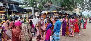 கோயிலை சுற்றி முககவசம் அணிய வேண்டும் என்கிற விளம்பரமோ அல்லது கோயில் தரப்பில் இருந்து வரும் பக்தர்களை ஒழுங்கு படுத்தி சாமியை தரிசனம் செய்துவிட்டுப் போகவேண்டும் என்கிற அறிவிப்பு எதுவும் அங்கு இல்லை.